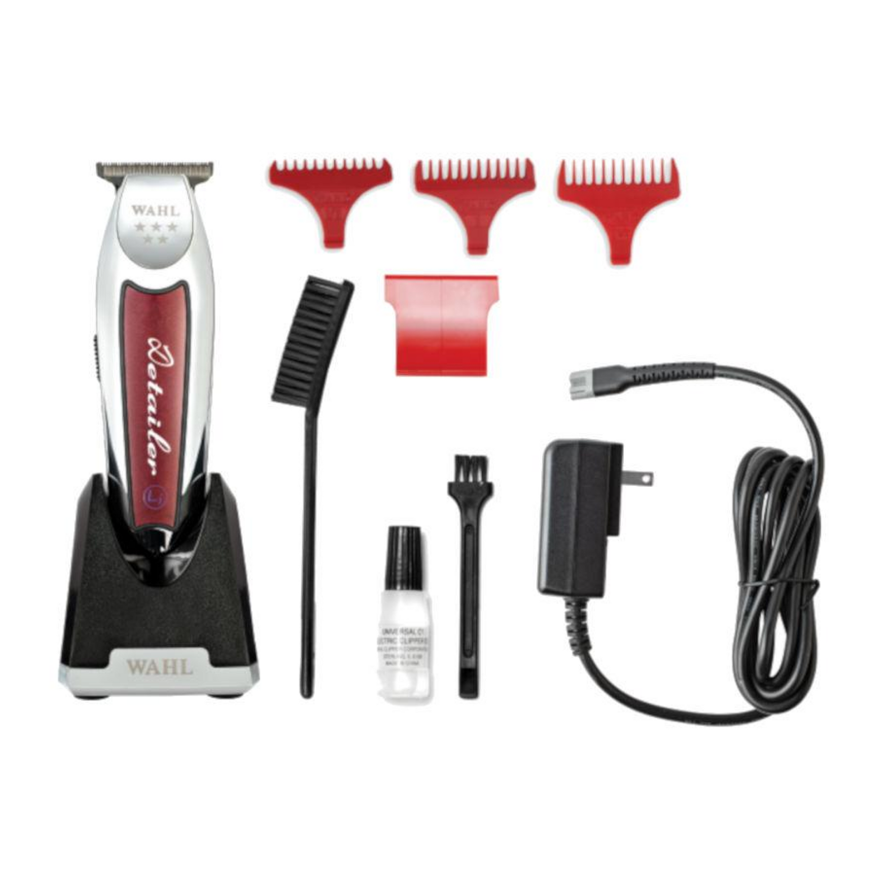 Accessories : 3 trimming guides (1/16" - 3/16"), recharging transformer, recharging stand, pre-shave brush, oil, cleaning brush, operating instructions & red blade guard