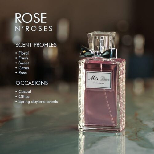 The freshness of an armful of cool and colorful petals, the energy of citrusy dew: the Miss Dior Rose N'Roses eau de toilette is a sparkling floral perfume, a profusion of roses from Grasse refreshed by a zest of bergamot and heightened by white musk and patchouli notes.