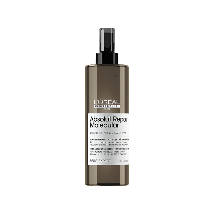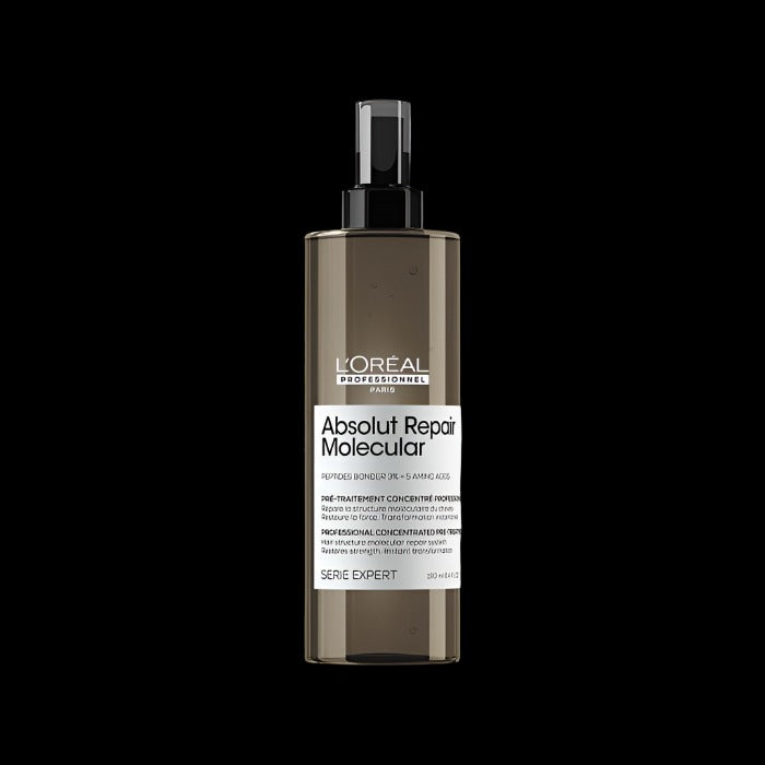 Step 1 at the sink before Absolut Repair Molecular Shampoo. • Pure strength concentration to restore hair elasticity** • 3% repair peptides (highest concentration in the range) • Instant transformation Cost per application Application = 9 ml 21 applications per bottle
